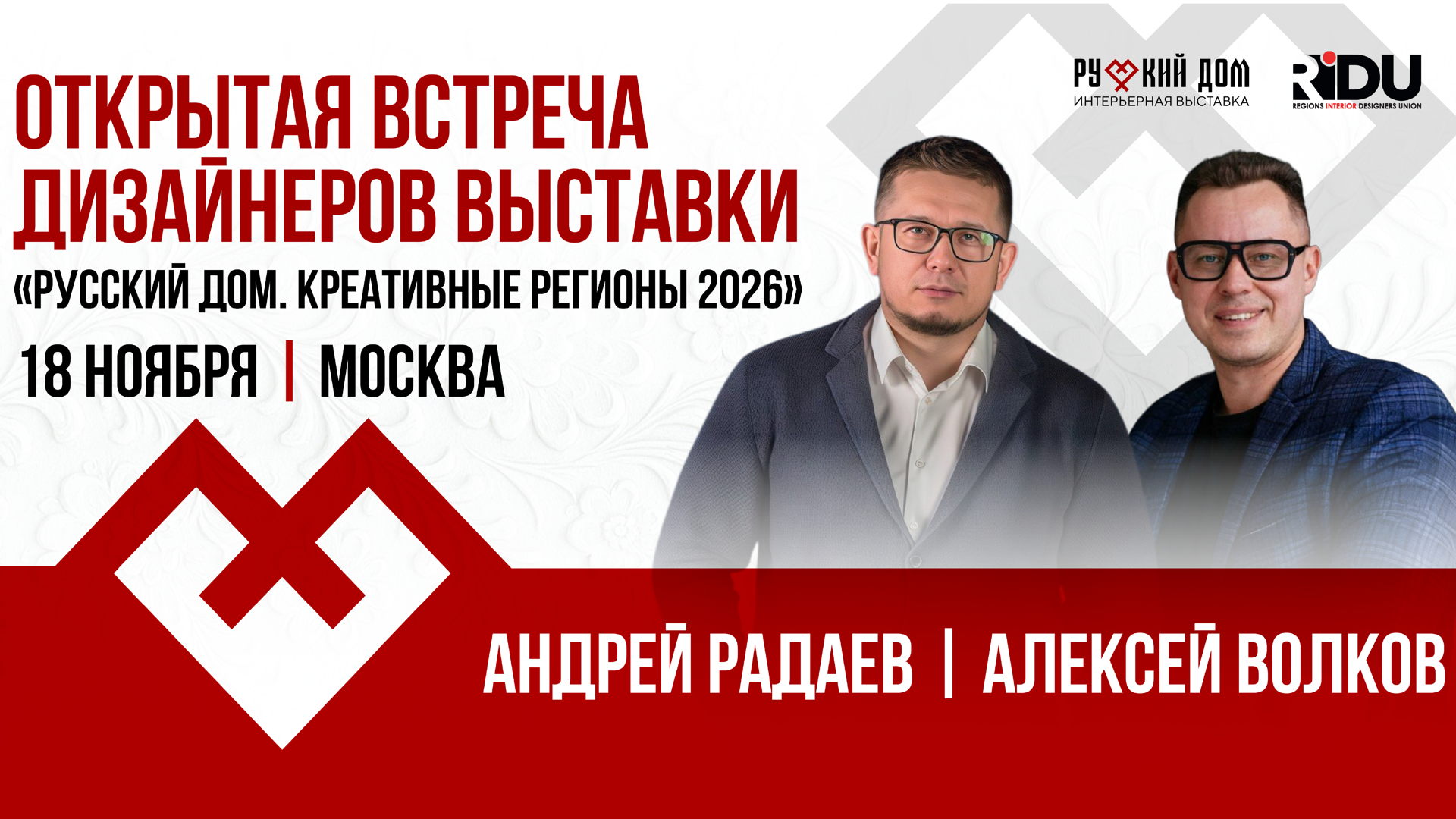 18 ноября в 16:00 приглашаем дизайнеров и поставщиков на встречу с организаторами выставки. Это возможность из первых уст узнать, как устроен проект «Русский дом. Креативные регионы», получить ответы на все вопросы и разобраться, как сделать участие в выставке максимально эффективным.
